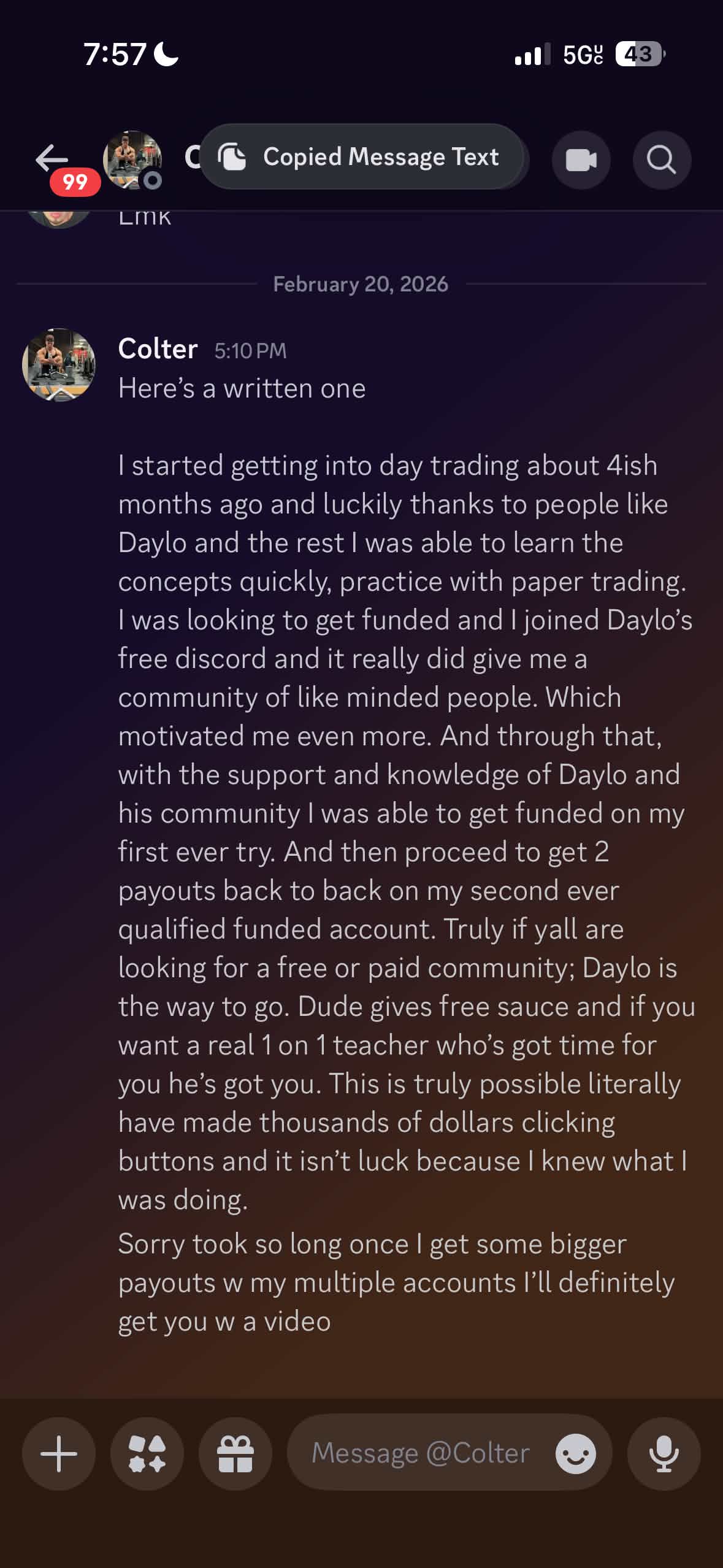 I have over 3 years of trading experience through which I have learned all of the ins and outs of the market. I have spent the last year mastering ICT concepts and perfecting the craft of implementing these concepts into practice by consistently predicting the market to nake money within it. I have gone from a random kid trading out of my moms basement to being able to take trips wherever and whenever I want while not missing a day of work. I have taken multiple traders from no prior knowledge to consistent payouts in as little as 2 months.